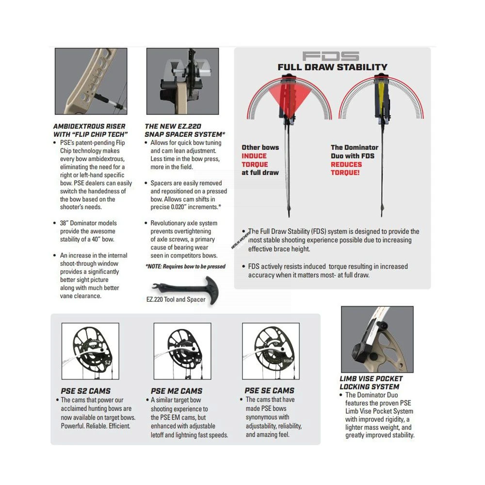 PSE is proud to introduce the new EZ.220 Snap Spacer System on the Dominator Duo, allowing for quick bow tuning and cam lean adjustment.